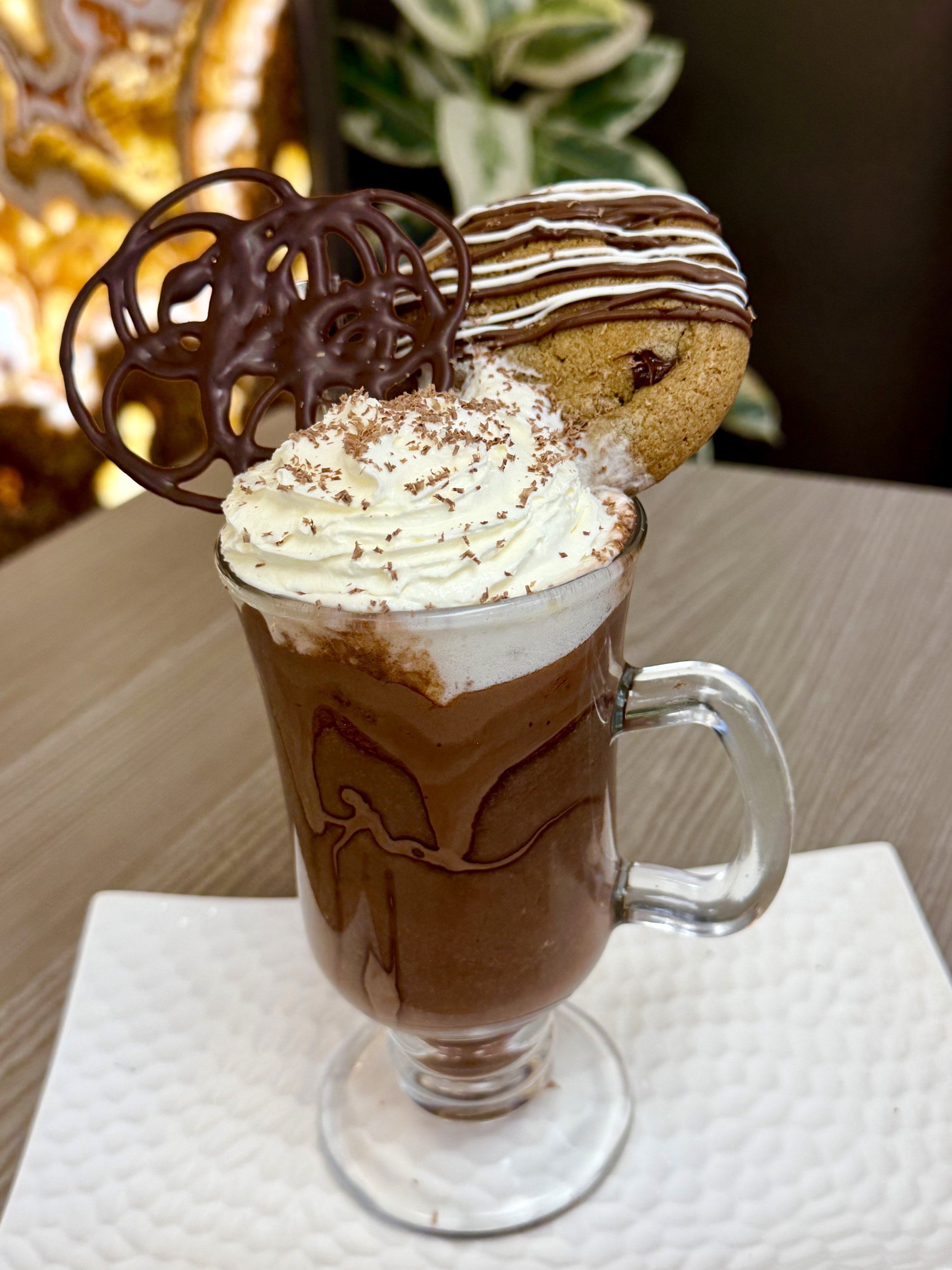 An opulent cup of hot chocolate crafted from premium melted chocolate and silky milk, delivering an intensely rich and velvety experience. Lavishly drizzled with more chocolate, crowned with whipped cream and fine chocolate shavings, and paired with a brown butter cookie for an unforgettable indulgence.