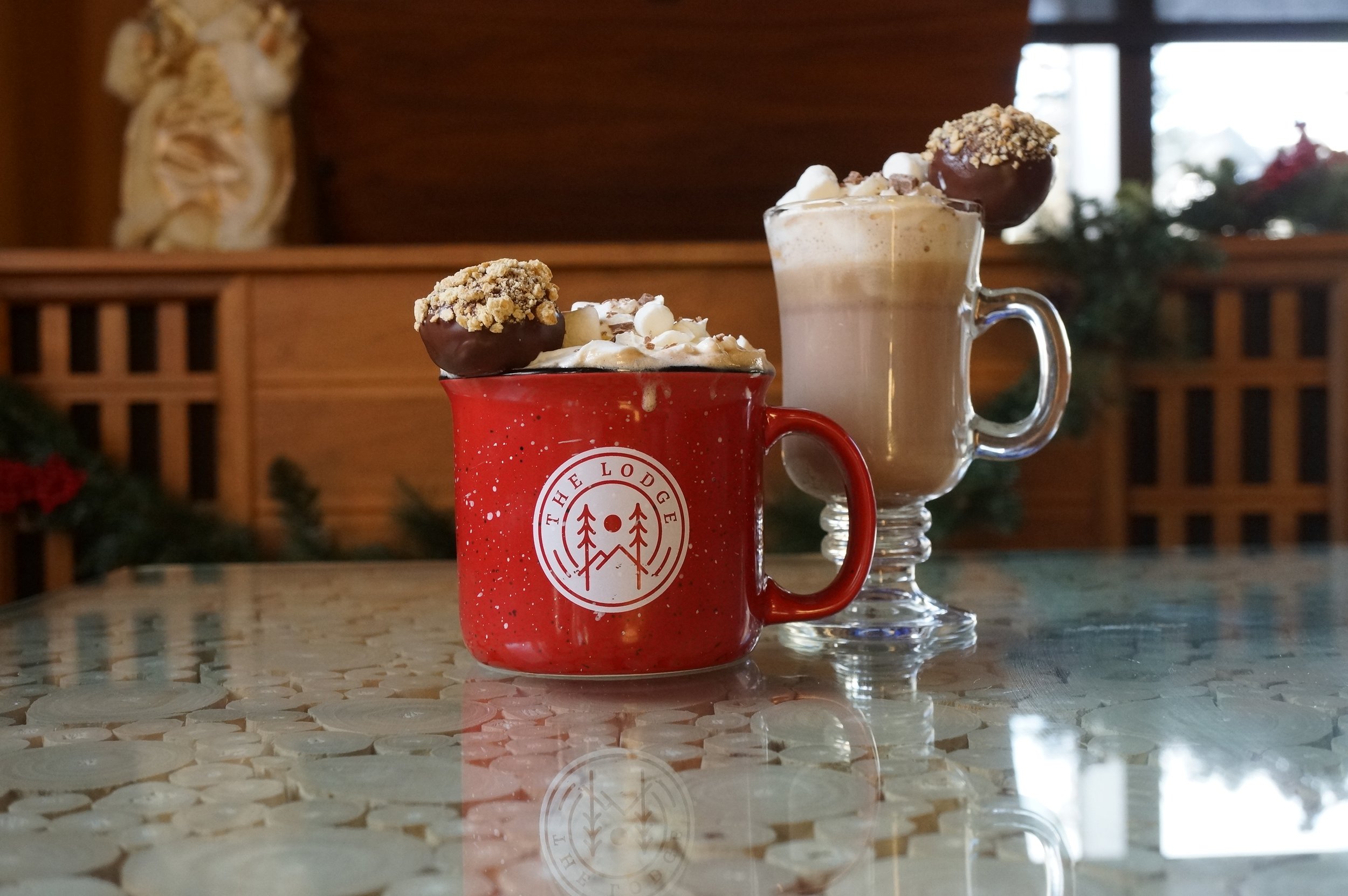 Inspired by our warm fireside vibes and that fresh chill across the mountains that can't get into your cozy log cabin, our hot chocolate brings all the warm and cozy Lodge vibes we all look for in the winter. With velvety dark chocolate, rich milk and a hint of cinnamon, topped with whipped cream, marshmallows and garnished with a home-made s'more cake pop, this delightful winter bevy is sure to bring happiness to all!