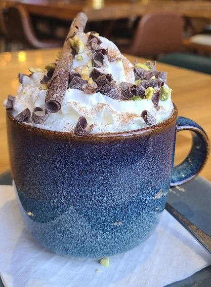 Discovering creative ways to enhance and elevate classic hot chocolate with exotic spices. Our spiced hot chocolate consists of Masala Tea spices, cardamom Chantilly cream and crushed pistachios.