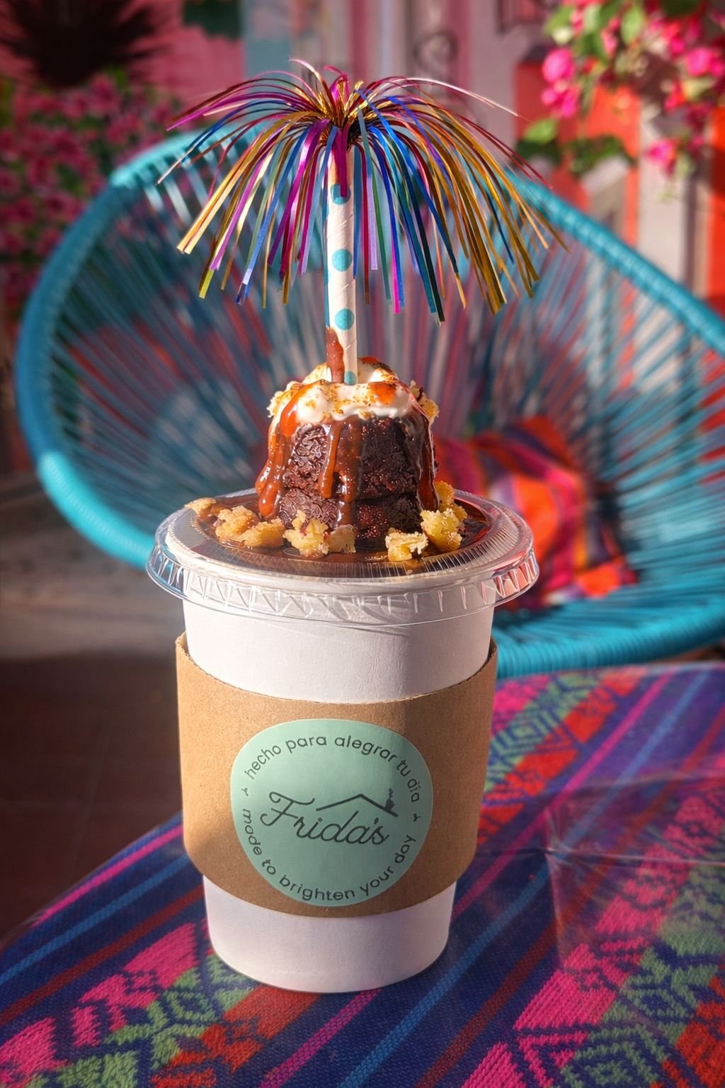 Inspired by the rich traditions of Mexican chocolate and the majestic landscape of Iztaccíhuatl, this spiced hot chocolate is crowned with whipped cream, a touch of chili, and a layer of melted dark chocolate beneath a fudgy brownie. Crumbles of churro surround it like sweet volcanic rocks — a decadent tribute to Mexico’s flavors and legends.