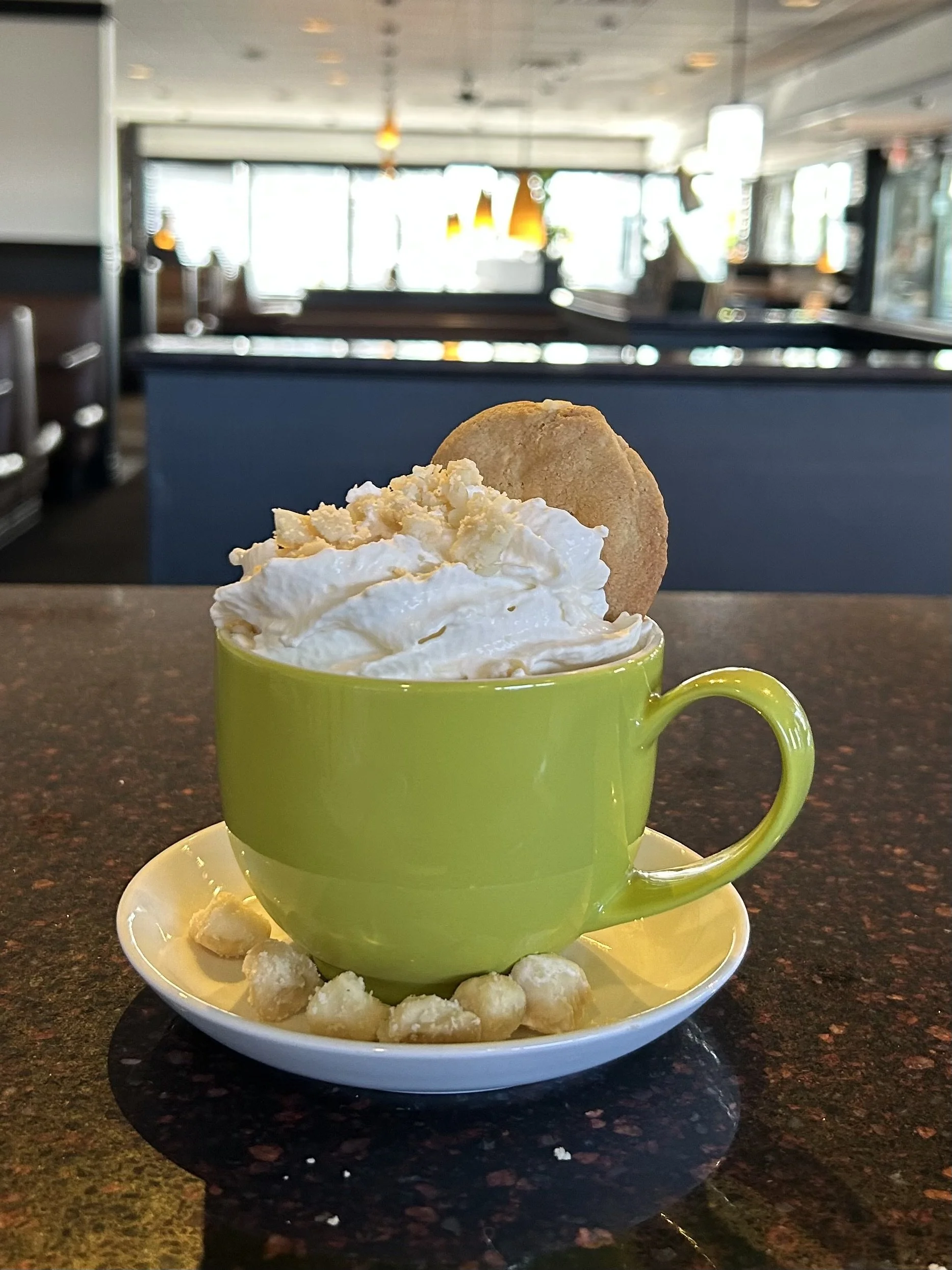 Macadamia syrup, chocolate milk, whipped cream, vanilla, macadamia nuts.