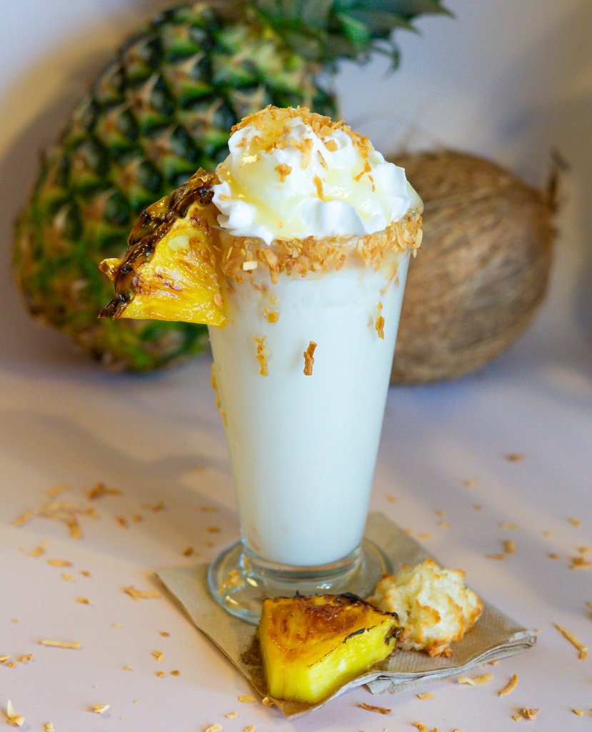 1) Nonalcoholic version: Our hot chocolate is made from Premium Swiss white chocolate, real coconut cream, real coconut milk and pineapple syrup; topped with real coconut whipped cream, home-made pineapple sauce and toasted coconut. Served with piece of fresh caramelized pineapple and home-made coconut macaroon (GF) on the side.
