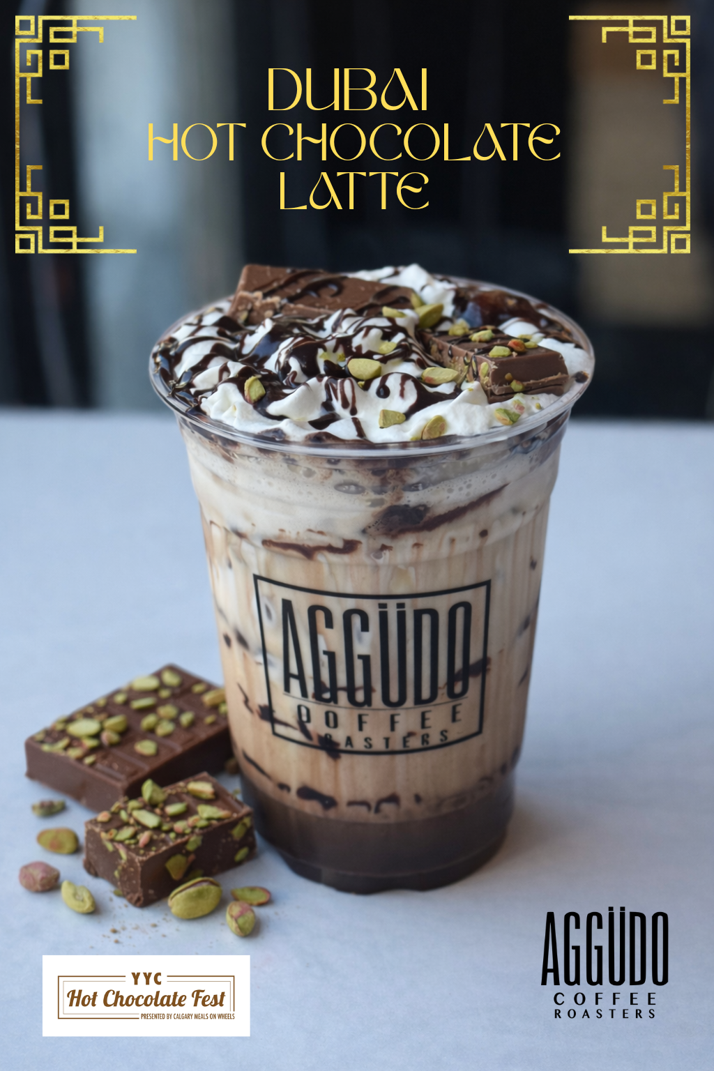Dubai Hot Chocolate Lattes are a viral sensation featuring rich chocolate sauce, nutty pistachio syrup, inspired by the viral "Dubai Chocolate Bar" that exploded in late 2023 after the drink went viral, AGGÜDO creating their own decadent versions, blending espresso with these distinct Middle Eastern flavors for a luxurious, layered coffee experience. People can have this amazing drink without espresso as well.