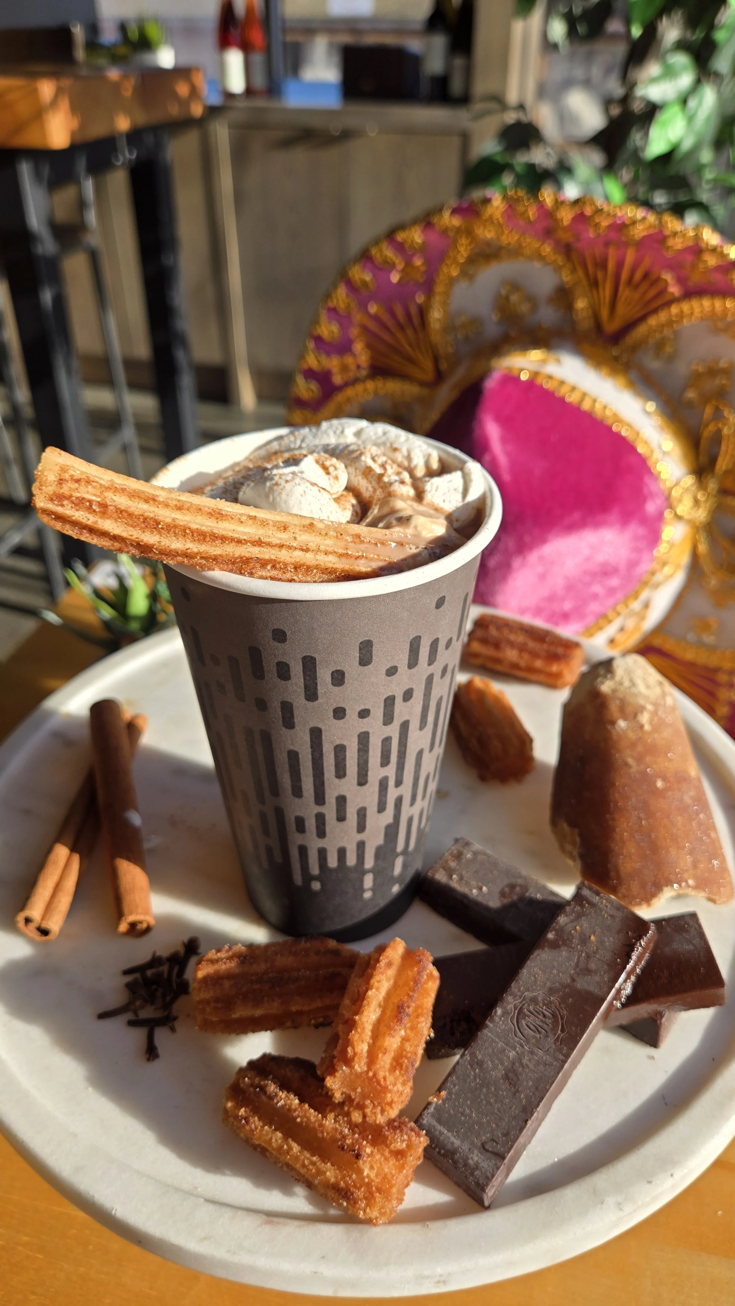 Mexican chocolate, Evaporated milk, condensed milk, Cinnamon, Cloves, Corn masa, Whipped cream, Churro