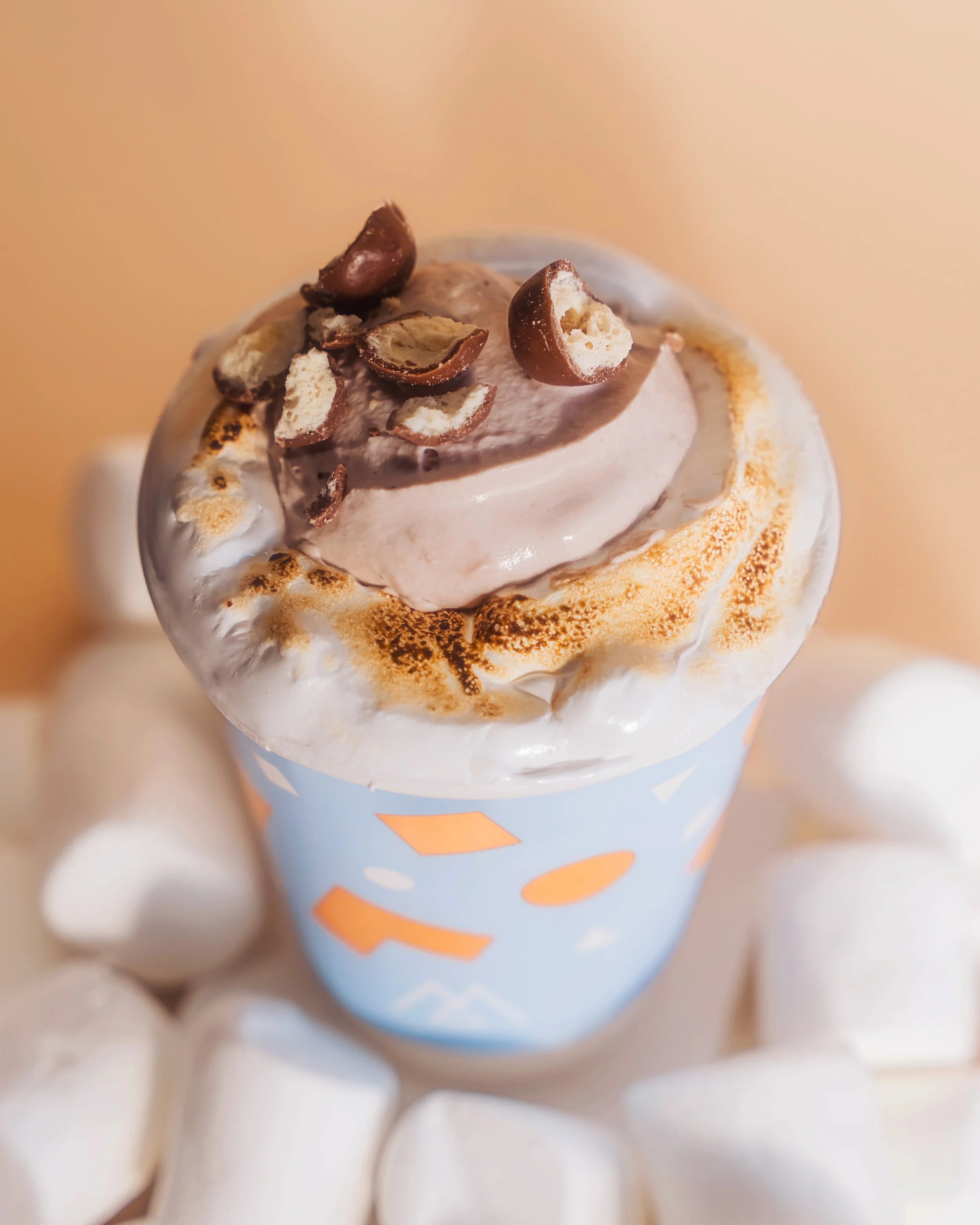 A dreamy malted white hot chocolate with a toasted marshmallow ring, topped with fluffy malted whipped cream and crushed maltesers.